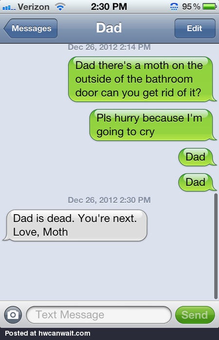 トイレから出れなくなった僕は、パパにメールをした。「蛾がトイレのドアの外にいる!!怖いからどっかにやって!!」。でも返事はない。さっきリビングにいたはずなのに。パパはいつも、高校生になっても蛾を怖がる僕をバカにしてる。もしかしたら意地悪してるのかもしれない。しょうがないから、またパパにメールをした。「お願いだからすぐに来て、もう泣きそうなんだ」。ほんとうに泣きそうだった。 ...そしてようやく返事が来た。
